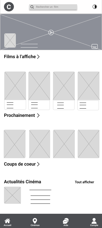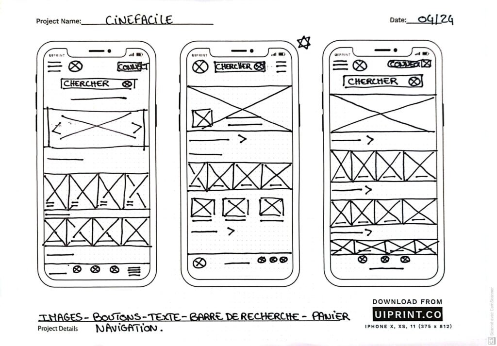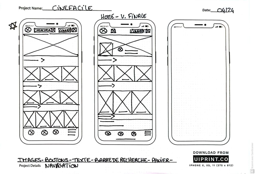 Prendre le temps de metre sur papier les itérations de chaque écran m’a permis de synthétiser les premiers retours des utilisateurs et d’assurer que chaque élément intégré aux wireframes numériques réponde à leurs besoins. Pour l’écran d’accueil, j’ai privilégié un parcours de sélection des films rapide et intuitif, guidant l’utilisateur directement vers l’essentiel.
