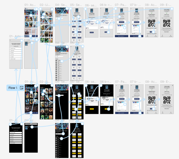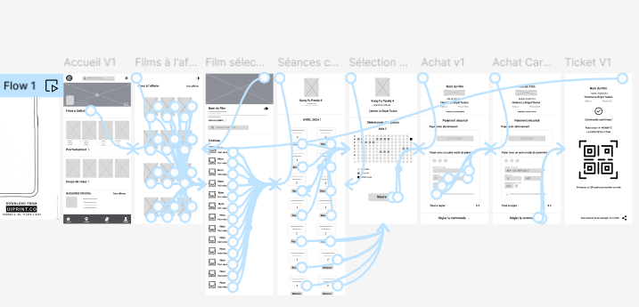 Pour les premiers wireframes numériques, je me suis appuyée sur les retours des pairs du cours Coursera et sur les entretiens utilisateurs. Une fois l’ensemble finalisé, j’ai créé un prototype basse fidélité, centré sur un flux clé : sélectionner un film et réserver une place à proximité, prêt à être testé lors d’une étude d’utilisabilité.