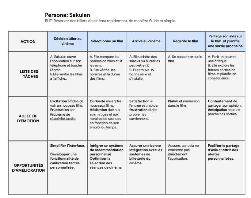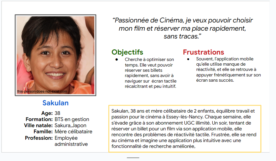 À partir des entretiens, j’ai créé le persona Sakulan, 38 ans, employée administrative et passionnée de cinéma. Elle a besoin d’une application d’achat de billets réactive, intuitive et facile à utiliser, afin de vivre pleinement sa passion sans perte de temps ni tracas.
